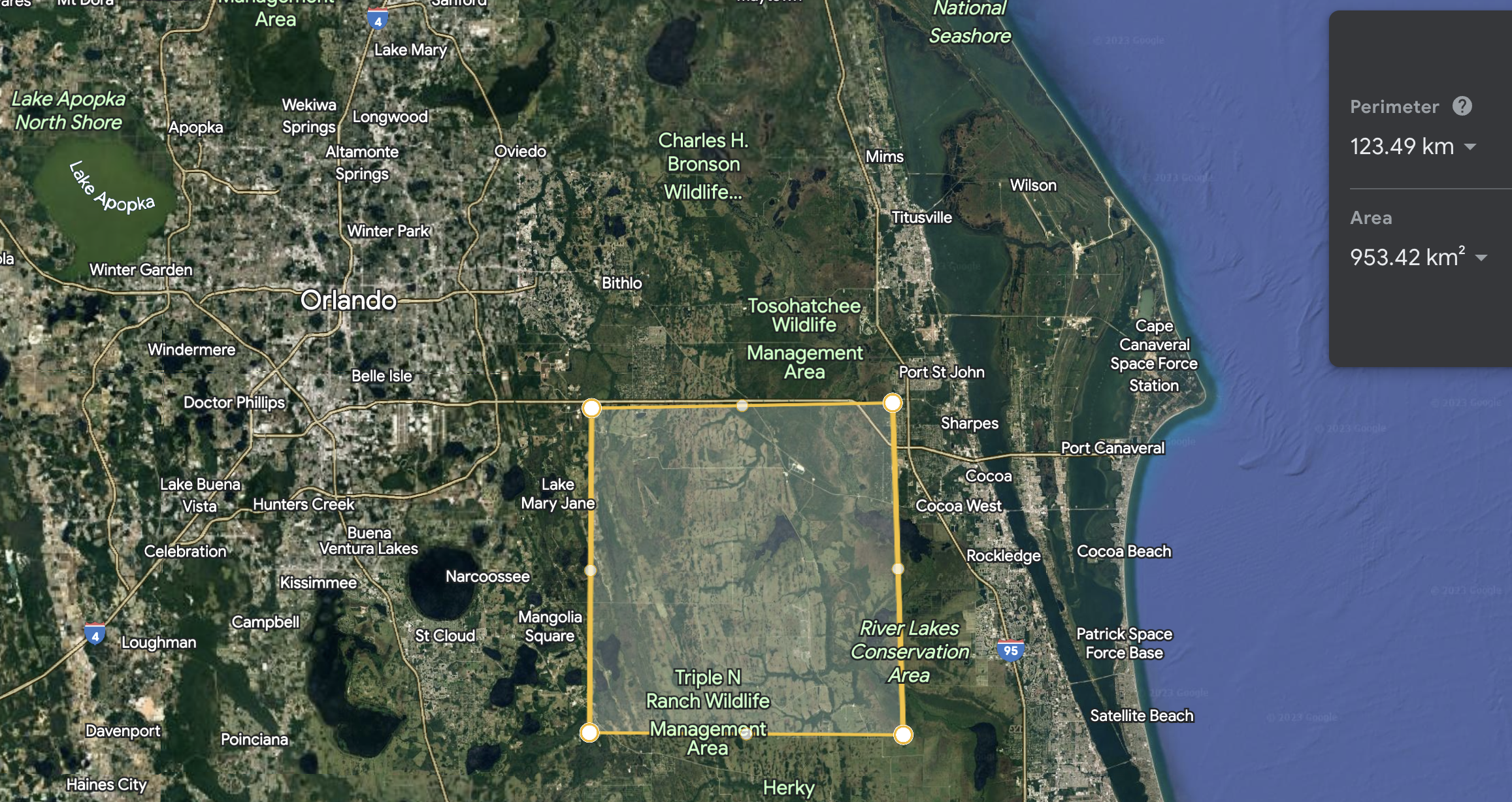 Now for the methane. One option would be to get a pipeline run to the site from a utility or even directly from some fracking site that produces natural gas. This seems like it would work,3 but means you’re strongly coupled to their fuel prices, which jump around a lot, and creating net CO2 flux into the atmosphere. A much more fun (and hopefully cheaper) option is to pull it out of the air as with the oxygen. We can buy methane generators from Terraform Industries, and run them nearby joined by a short pipeline. Assuming an efficiency of ~30% for electrical power -> methane power (is that too generous? Let me know!), we’ll need roughly 3x 14GW = 42GW of solar power to produce our fuel. Looking at this map from NREL, we can expect 5 kWH / (m2 day) of solar flux in south Florida on average, or 1kWh/(m2 day) electrical power assuming a 20% panel efficiency. That’s 42 W / m2 electrical power,4 so we’ll need roughly 109 m2 = 1000 km2 of panels, or a square 31 km on a side. Here’s what that would look like: